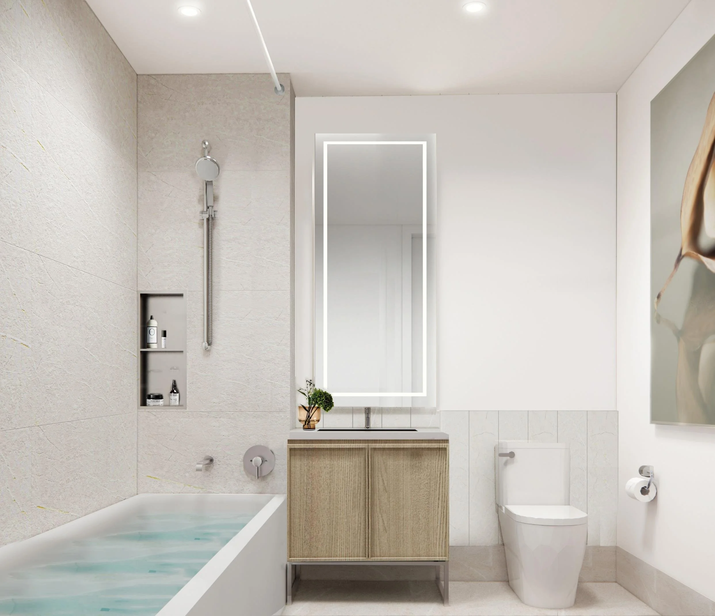 Bathrooms evoke a spa-like retreat, featuring sleek white countertops atop custom light woodgrain vanities. Elegant Italian ivory tile extends dramatically to the ceiling, creating a sense of height and tranquility. Chrome Cantrio fixtures complete the refined look, offering both durability and understated luxury.